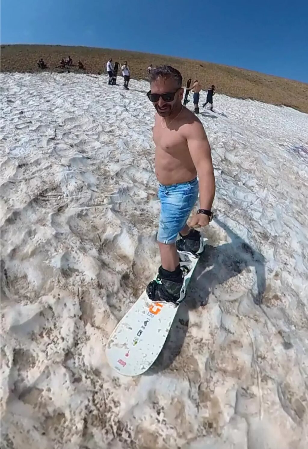 ERZİNCAN’da bir küme genç, ağustos ayında Ergan Dağı’nın tepesindeki kar kalıntılarında kayak ve snowboard yaptı, eriyen kar sularıyla oluşan gölde serinledi.