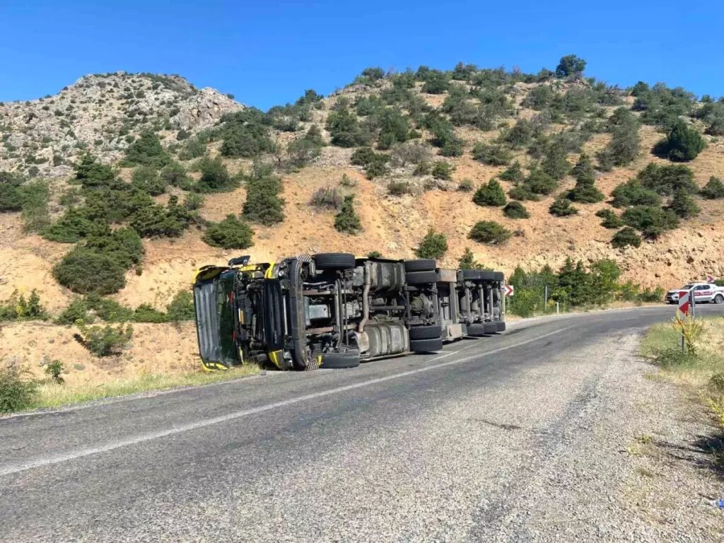 Erzincan’ın Kemaliye ilçesinde virajı alamayan tır devrildi.