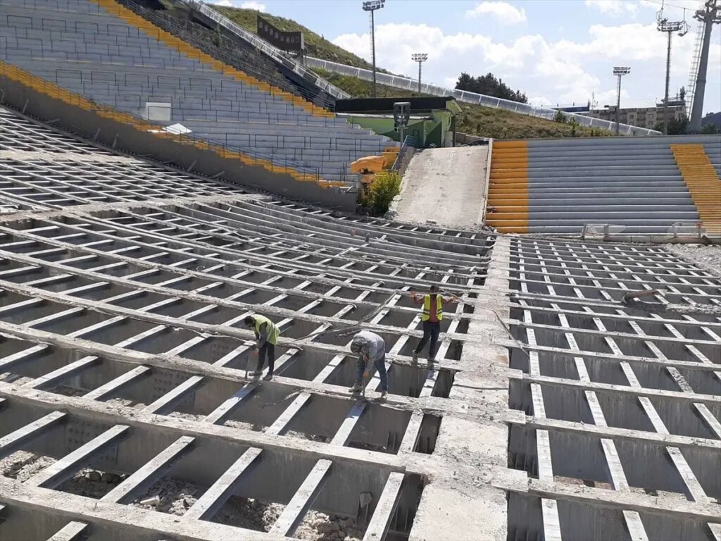 Türkiye’de tek olan Erzurum’daki kayakla atlama kulelerinde taban tadilatı sonrası ahşap pist çalışmaları devam ediyor.