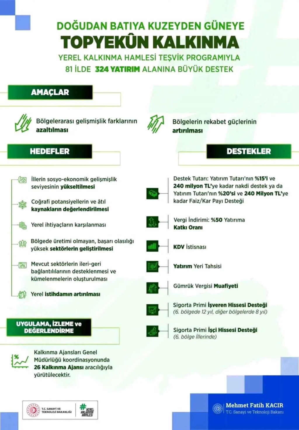 Programla birlikte; mahallî istihdamın artırılması, coğrafik ve sektörel potansiyelin kıymetlendirilmesi, atıl kaynakların iktisada kazandırılması ve yeni sanayi kümelerinin oluşturulması hedefleniyor. Her vilayet için dört öncelikli yatırım alanı belirlenirken, desteklenecek projelerin tamamı fizibilite raporuna dayalı olarak pahalandırılacak.