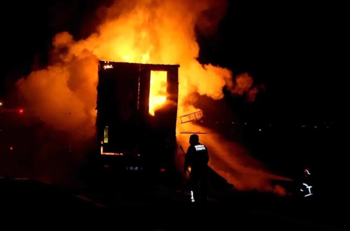 Erzincan'ın Tercan ilçesinde bir tırın dorsesi alev alev yanarken, şoför yangına müdahale etmeye çalıştı....